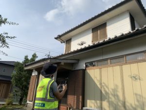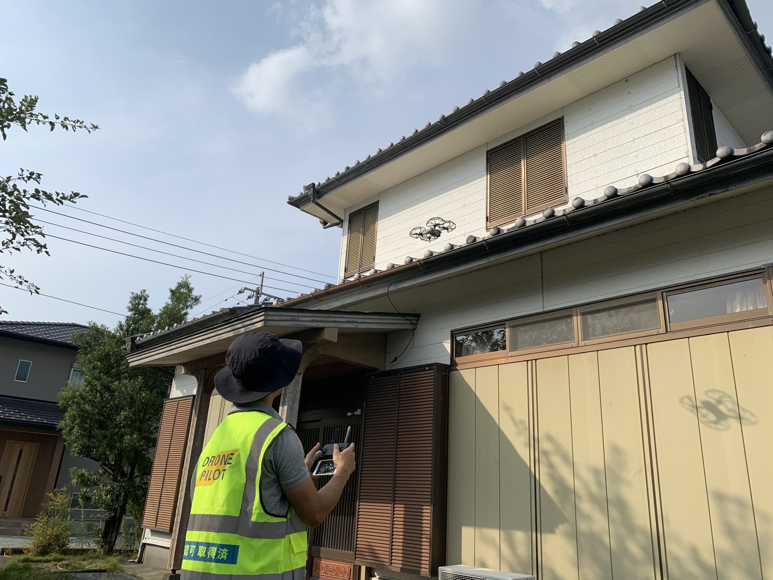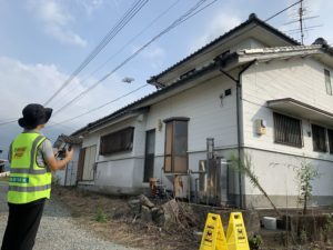 以前の損害調査は、梯子を使い、屋根の上に登り調査をしていました。 ドローンを使うことで損害箇所を発見し、間近で写真撮影ができます。